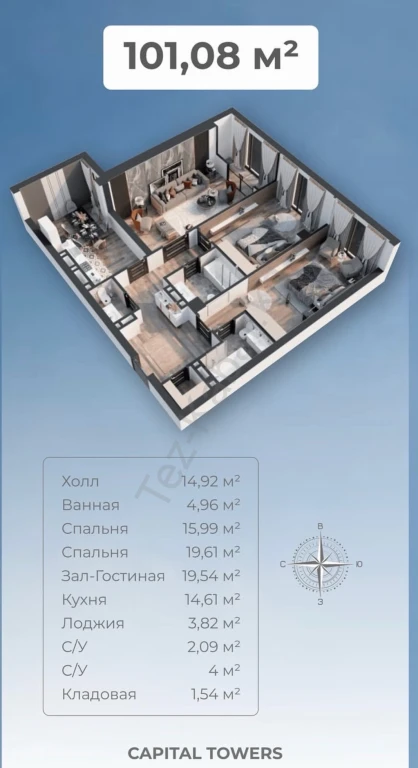Представляем вашему вниманию просторную 3-х комнатную квартиру в ЖК бизнес-класса Capital Towers!